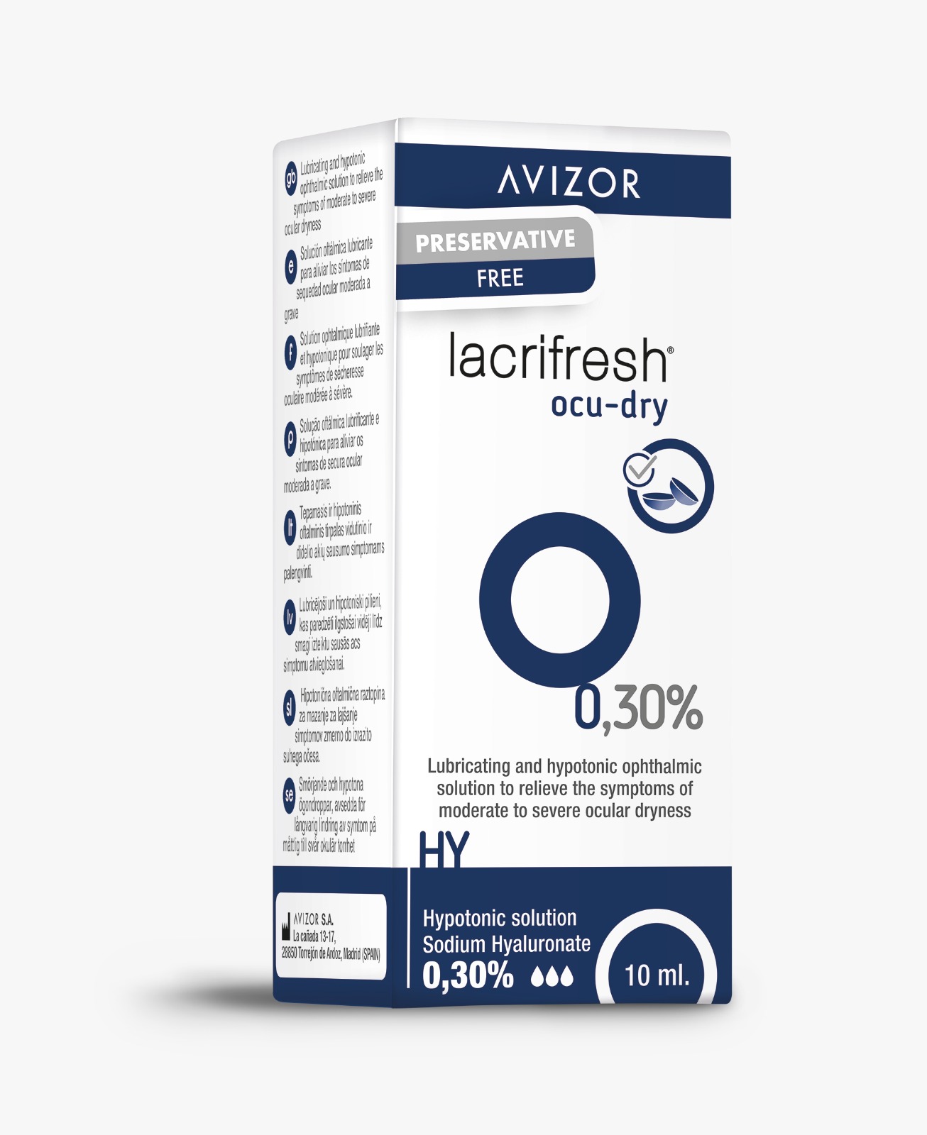 Alivio de los síntomas de sequedad ocular moderada a severa. Posee una concentración aun más baja de Cloruro Sódico que Lacrifresh ocu-dry 0,20%; es el más hipotónico de los dos productos. Está indicada para pacientes que sufren de sequedad ocular moderada o grave proporciona un alivio prolongado de sus síntomas. Solución acuosa, tamponada e hipotónica con hialuronato de sodio 0,30% glicerina y electrolitos esenciales (CL-, Na+, Ca2+, K+, Mg2+).